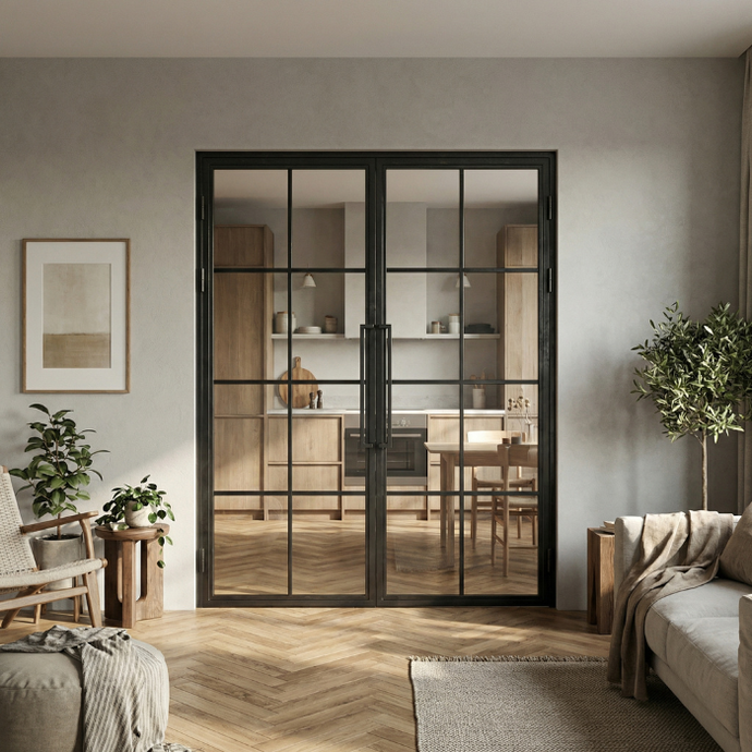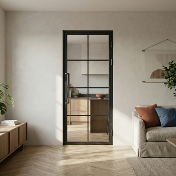 De strakke vakverdeling brengt orde en balans, terwijl het glas zorgt voor maximale lichtdoorlaat. Het staal omlijst elk vlak met precisie en geeft de deur zijn krachtige uitstraling. Ideaal voor wie houdt van een uitgesproken ontwerp dat toch tijdloos blijft.