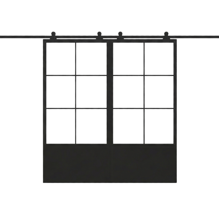 2x steel door (1 mm steel) with safety glass (4 mm), rails and mounting material.