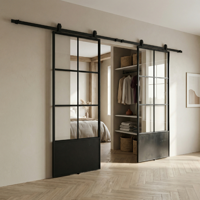 These doors combine the robust, industrial look of steel with the space-saving benefits of a sliding mechanism, making them perfect for any modern interior. Ideal for elegantly separating spaces without compromising on light or spaciousness.