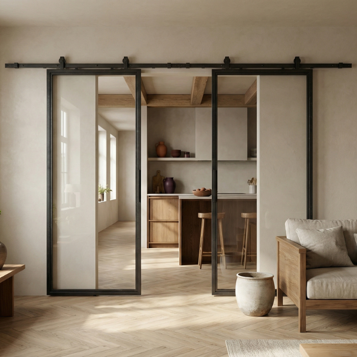 These doors combine the robust, industrial look of steel with the space-saving benefits of a sliding mechanism, making them perfect for any modern interior. Ideal for elegantly separating spaces without compromising on light or spaciousness.