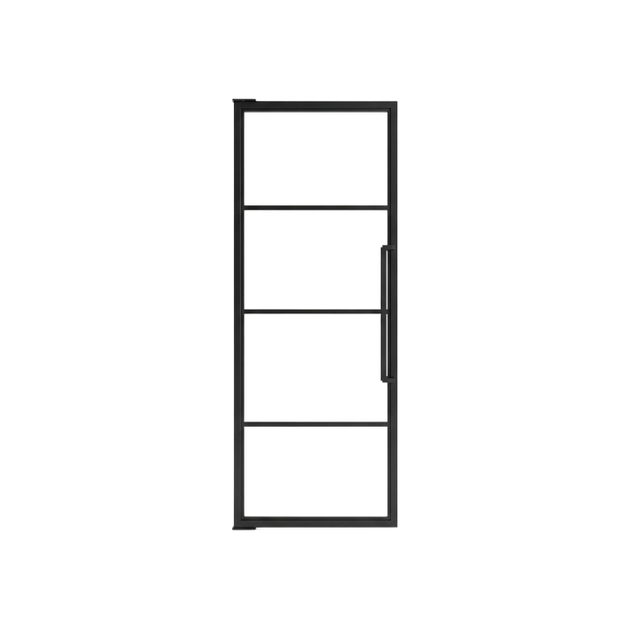 The door is made of black powder coated steel and is equipped with a modern handle. The steel doors are available in clear glass or frosted glass.